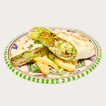 ひよこ豆のコロッケファラフェルと野菜をラップサンドした一品。付け合わせにピクルスもおすすめ!