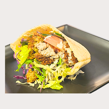 ひよこ豆のコロッケファラフェルと野菜をピタパンでサンド。付け合わせにピクルスも一緒におすすめです!